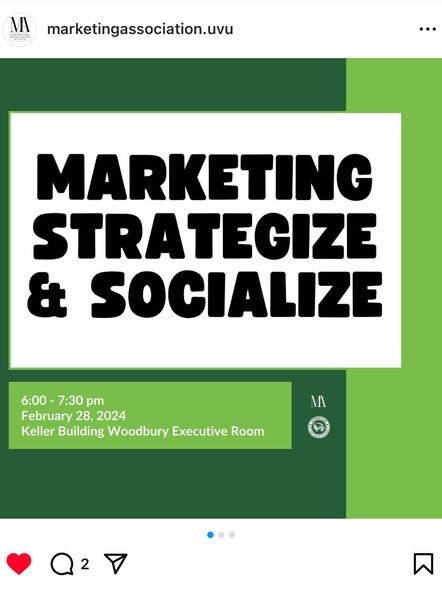 As the Vice President of the Marketing Association, I created and managed all social media channels. This includes flyers, social media posts, event photography, and follow-up emails. Continuous social media engagement resulted in an event attendance up 350% from the previous year. More content can be viewed on the portfolio page.